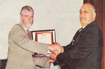 Ben O'Haggen, Chief executive of BVQI Oman left, presenting the certificate to Abdullah Hussain Jamal, President, Arabian Project & Transport Co.  |